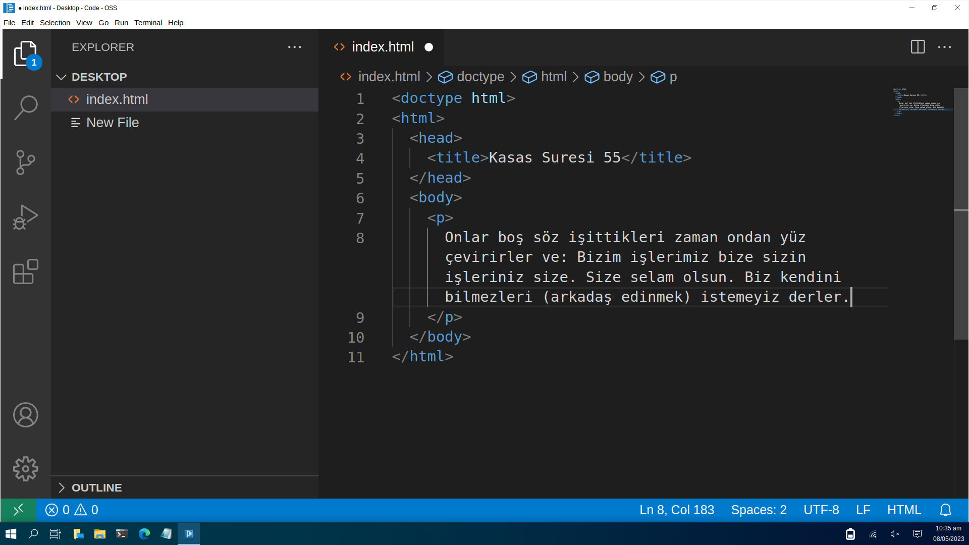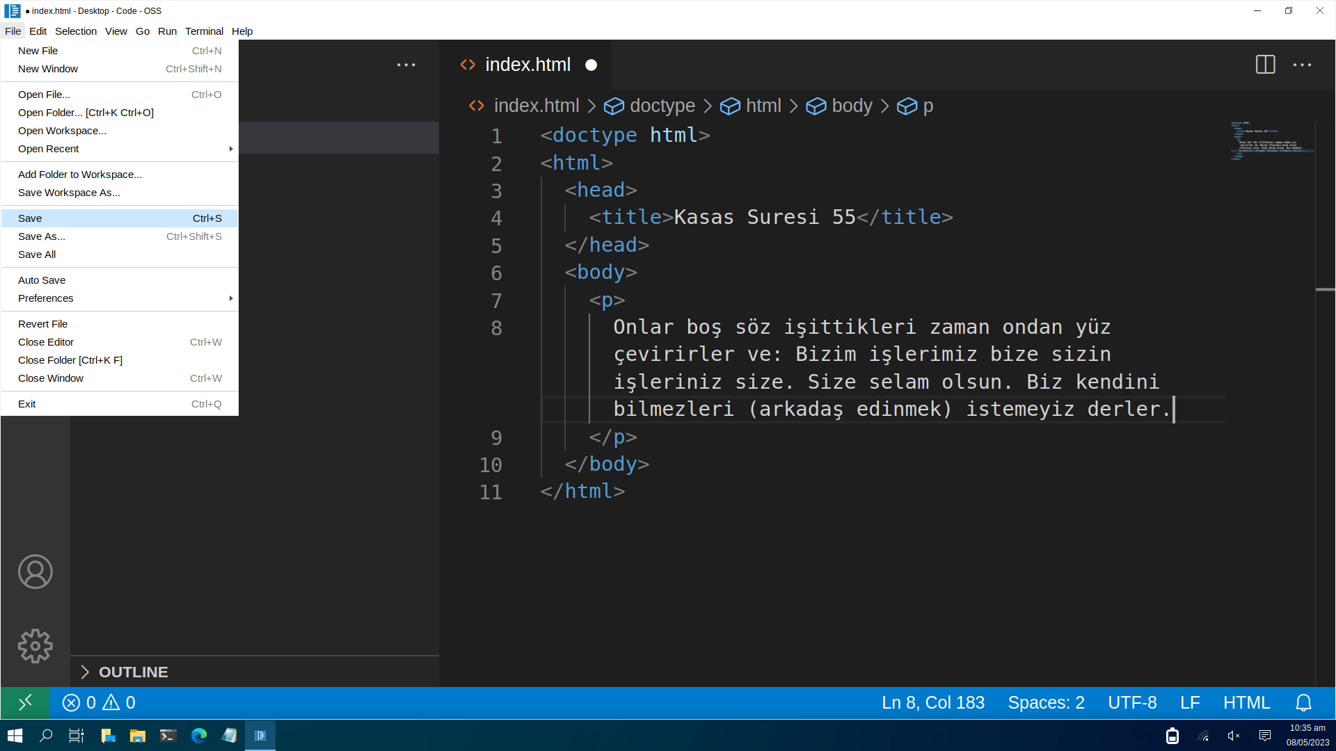 Kodlarımızı girdik fakat kodlarımız dosyaya kaydedilmedi. Kodlarımızın kaydedilmediğini "index.html" yazısının yanındaki beyaz yuvarlaktan anlayabilirsiniz. Kodlarımızı dosyaya kaydetmek için en sol üstte yer alan "Dosya" yazısına tıklıyoruz ve "Kaydet" butonuna tıklıyoruz. (Kodlarınızı klavye kısayollarıyla kaydetmek isterseniz klavyenizdeki "Ctrl" tuşuna basılı tutarken "s" tuşuna tıklayabilirsiniz.)