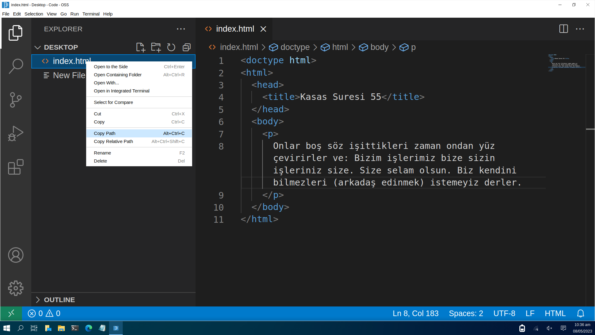 Kodlarımızın sonucunu görmek için sol menüden "index.html" yazısında sağ tıkla tıklayarak "Yolu Kopyala" butonuna tıklıyoruz ve ardından kopyaladığımız bağlantıyı tarayıcımızın adres çubuğuna gelerek yapıştırıyoruz.