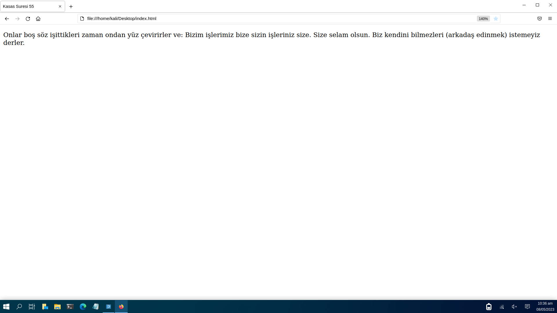 Adres çubuğu google arama çubuğu değildir. Adres çubuğu tarayıcınızın en üstünde yer alan kutucuktur. Yani aşağıdaki görselde file:///home/kali/Desktop/index.html yazan yere kopyaladığınız şeyi yapıştırmanız gerekmekedir. Sizde file:///home/kali/Desktop/index.html yazmaz. Çünkü henüz yapıştırma işlemini tamamlamadınız ve yapıştırma işleminden sonra sizde farklı birşey yazabilir bunda hiçbir problem yoktur çünkü kişiden kişiye değişebilir. Yapıştırma işleminden önce orada yazan yazıyı silin ve fareniz ile adres çubuğunun üzerine geldikten sonra sağ tıklayarak açılan menüden yapıştır seçeneğini seçin. Yapıştırma işleminden sonra klavyenizdeki enter tuşuna tıklayınız.