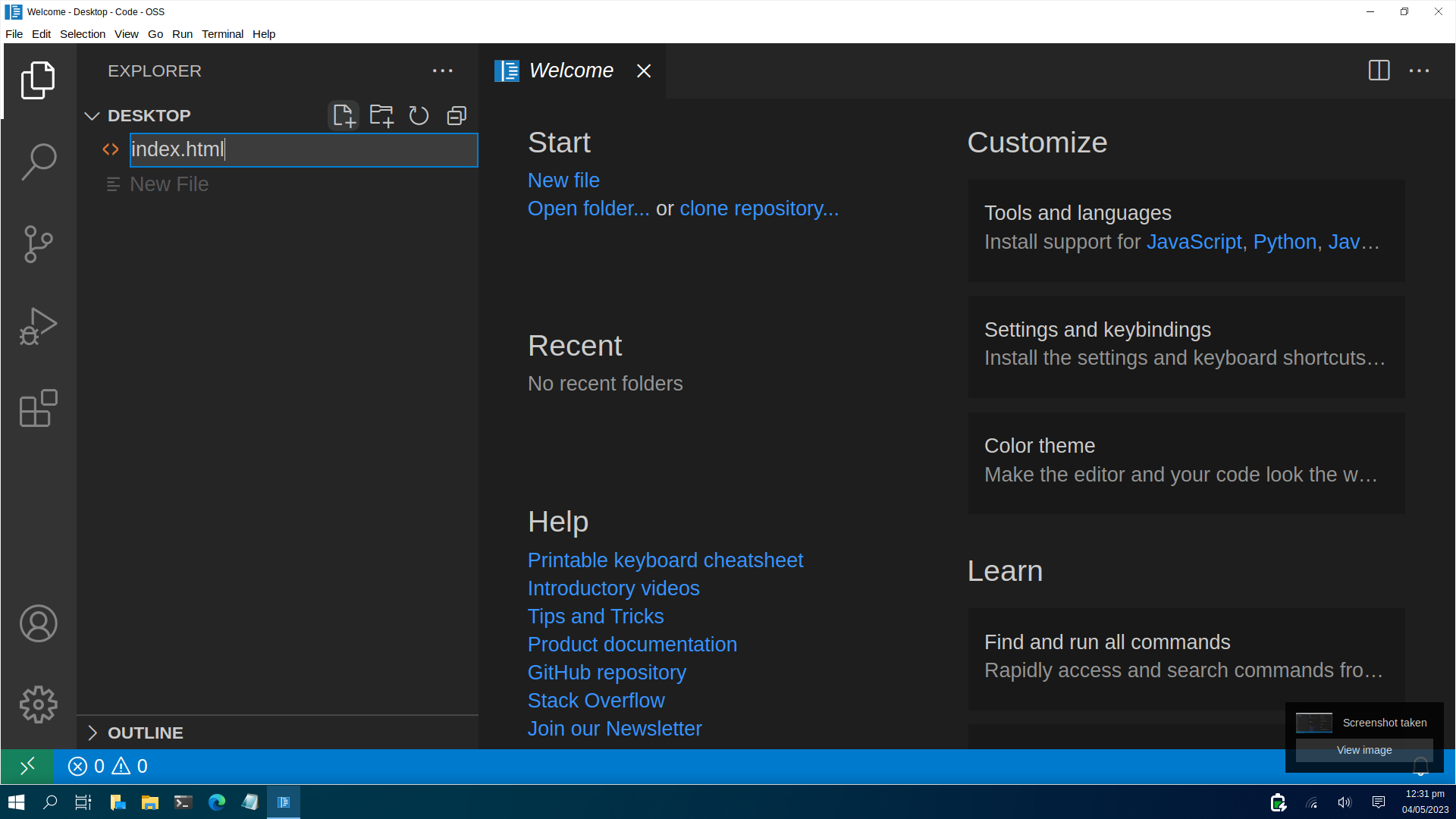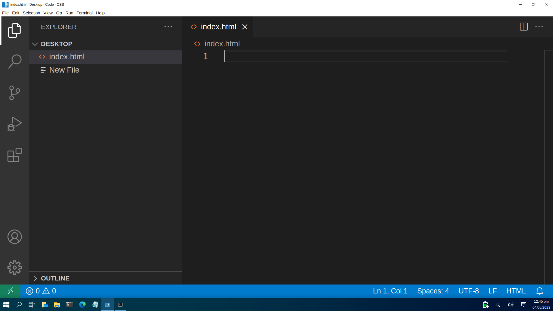 Tıkladıktan sonra açılan metin girme alanın "index.html" yazıyoruz ve "Enter" tuşuna basıyoruz (index.html yazdıktan sonra fare ile farklı bir alana da tıklayabilirsiniz).